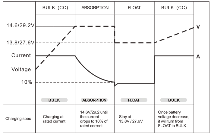 Batterikontroll (3-trinns batteriladere) Bulk /Absorpsjon /Flyt